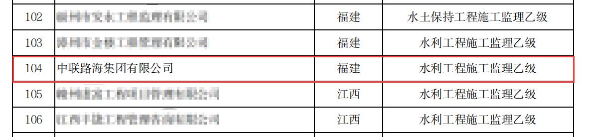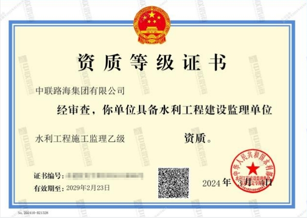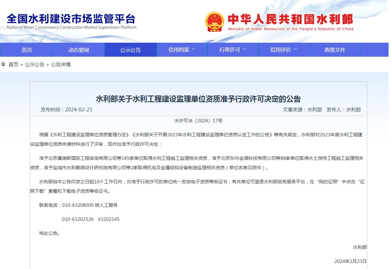近日,,,中华人民共和国水利部发布《关于水利工程建设监理单位资质准予行政许可决定的公告》(水许可决[2024]17号),,尊龙时凯集团有限公司通过层层审查,,,成功通过评审,,,,获得“水利工程施工监理乙级”资质。。。